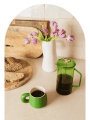 "Grind coffee, pour hot water, wait, stir, press, pour, drink, and enjoy! The French Press is a brew method that allows you to get caffeinated very easily."